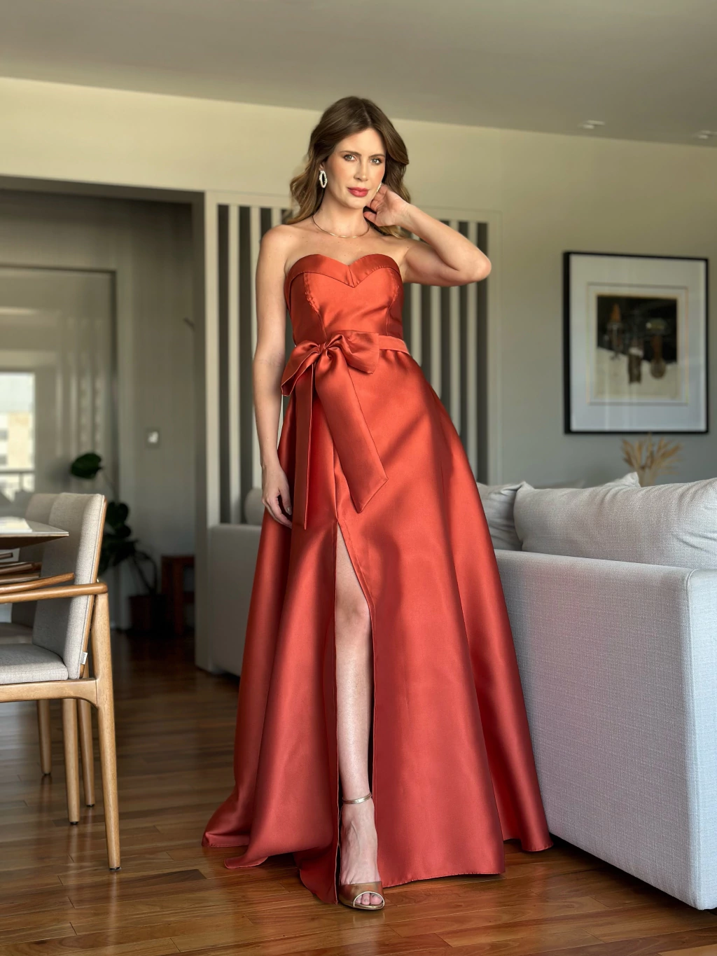 A fenda traz um toque de ousadia ao vestido, sem perder a sua essência clássica. Considerado uma peça versátil e atemporal o vestido pode ser usado por madrinhas de casamento, mães de noivas, formaturas e debutantes.
