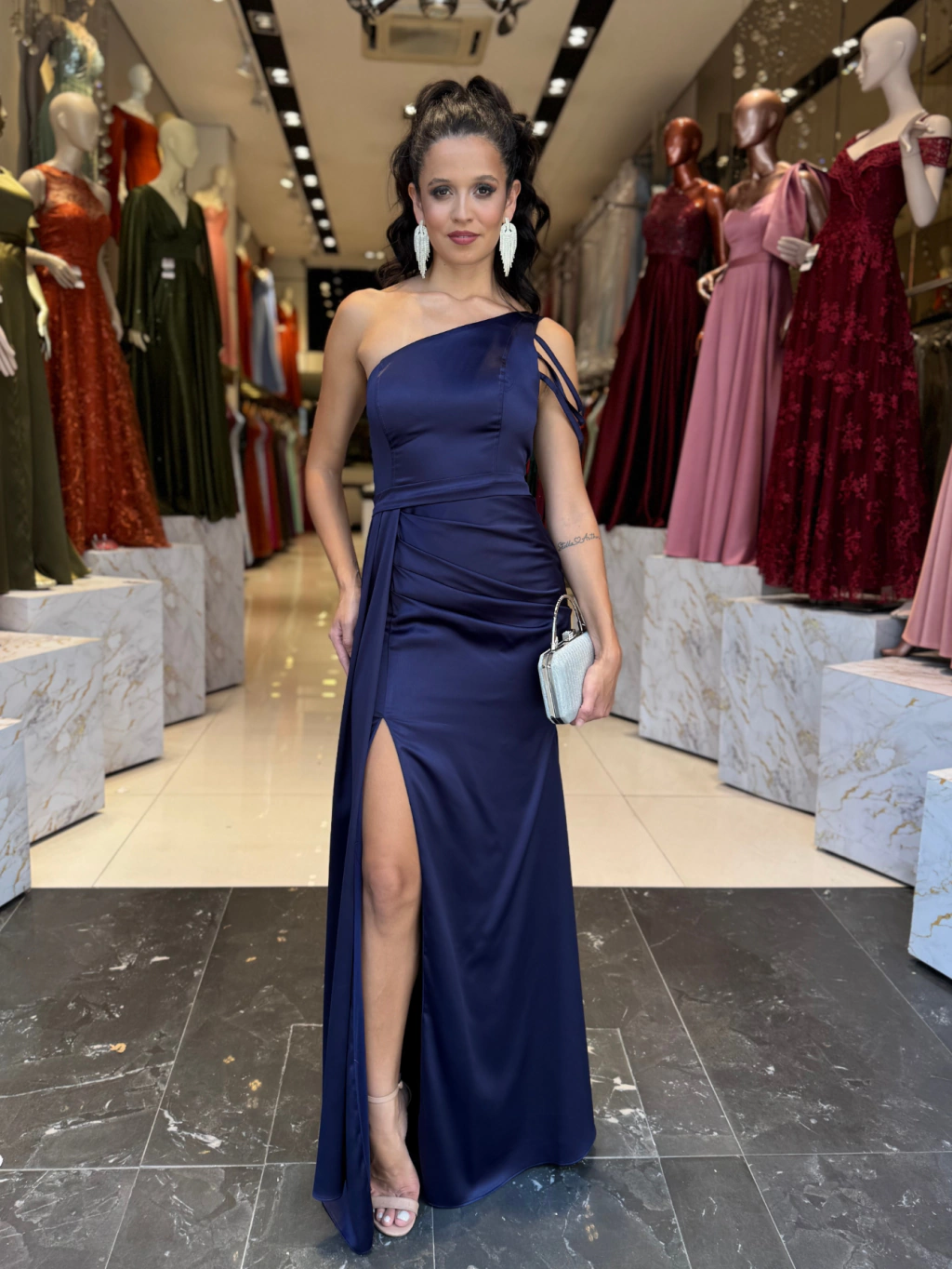 A modelagem longa em estilo sereia de nula manga ( manga única/ombro só), possui um formato drapeado na parte frontal da região do quadril ajustado ao longo da silhueta, ele conta com uma fenda lateral acompanhada de uma cauda da altura da cintura até a barra.