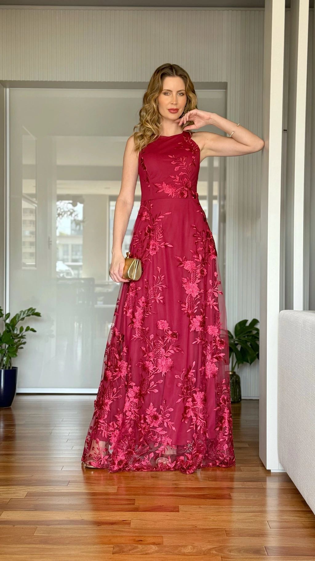 Encante com a exuberância deste vestido longo em tule bordado, perfeito para ocasiões especiais que pedem um toque de glamour e feminilidade.