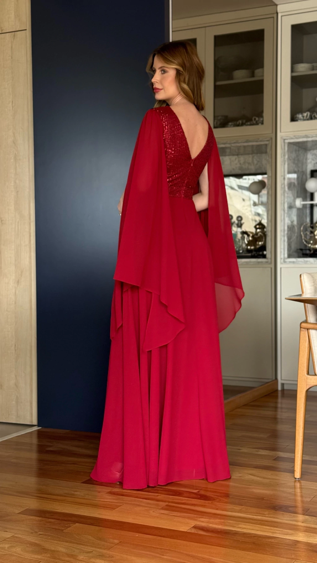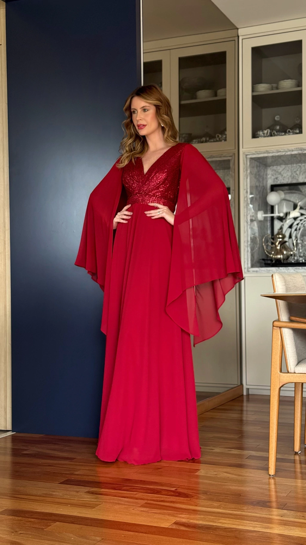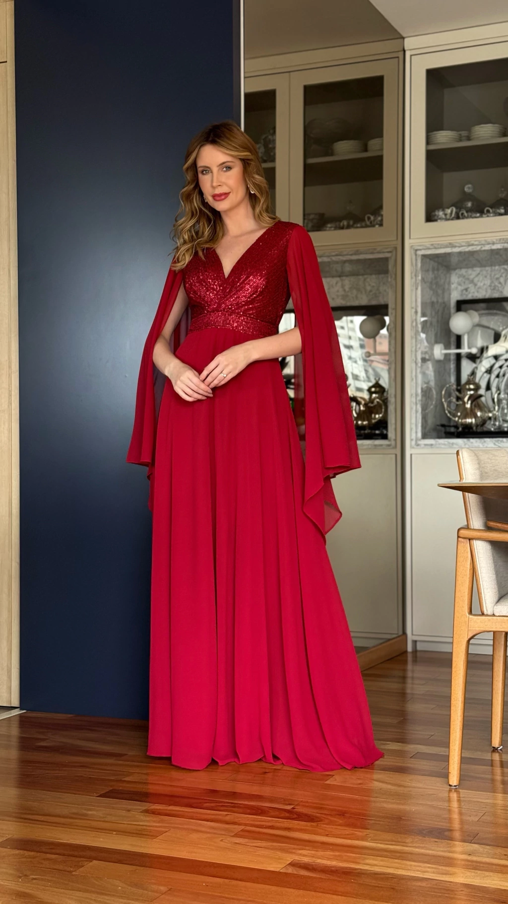 Ele combina a leveza do chiffon fluido com o brilho sutil e luxuoso dos paetês delicadamente bordados na parte superior. O decote em “V” valoriza o colo com suavidade, enquanto as mangas longas e esvoaçantes em tecido translúcido criam um movimento etéreo a cada passo, transmitindo graça e imponência.