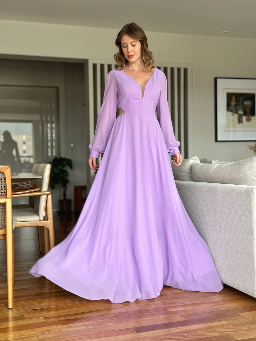O vestido Serena é feito em crepe chiffon, leve e fluído, tem mangas longas com as bordas drapeadas e fechamento no pulso com botões super delicados. Tem decote em V com uma transparência em tule duplo, possuí bojo . A leve abertura na cintura, agrega charme e sofisticação ao look . Na cintura tem um fino elástico embutido que proporciona um melhor caimento. Uma ótima opção pra ser usado em eventos no inverno ou verão ,pra quem quer um vestido leve, com balanço, cheio de personalidade e lindo !!